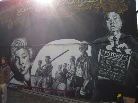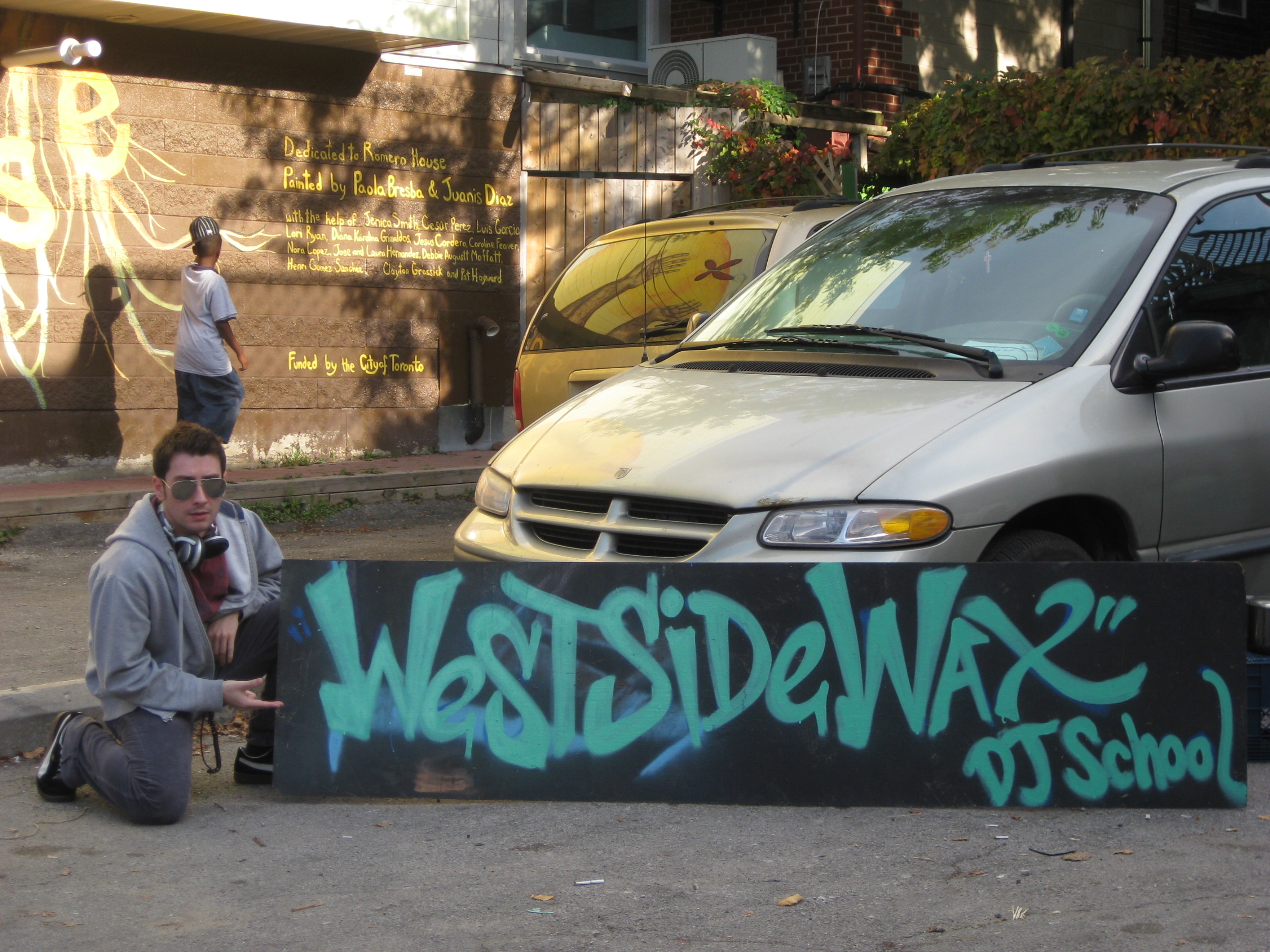 I met WestsideWax a few years back when I was living near Bloor-Lansdowne in Toronto. We were both active posters on Tribe.ca and started bumping into each other at techno jams in the west end. In 2008, WestsideWax started up a part-time dj school and co-ordinated his launch with ComeUnity‘s graffiti activism event that spanned the alleyways and sideroads from Dundas West subway station to Keele. The majority of the graffiti you see out the window while you’re riding the subway between those two stops was put up over that late summer festival weekend in 2008….